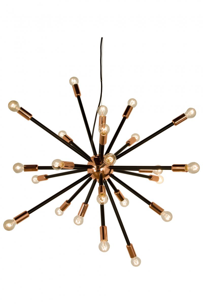 Mustan ja kuparin värinen, 90 cm leveä kattovalaisin Scan Lamps Ray on 24-osainen, suurikokoinen ja näyttävä kattovalaisin, joka antaa riittävästi valoa isoonkin huoneeseen. Valaisimen lopullisen ilmeen voit viimeistellä lamppuvalinnalla. Valaisin antaa tarvittaessa runsaasti valotehoa 24 valopisteellään. Himmennettävillä valonlähteillä voit säätää valon määrää ja LED-lampuilla lisäksi säästää energiaa, vaikka valoa tuleekin paljon. Asennusta helpottavat kätevä kattokoukkukiinnitys sekä pistoke. •Korkeus: 900.0 mm •Halkaisija: 900 mm •Lamppukanta: E14 max 24×25 W •Ripustuskaapelin pituus: 1200 mm •Polttimot eivät kuulu toimitukseen.