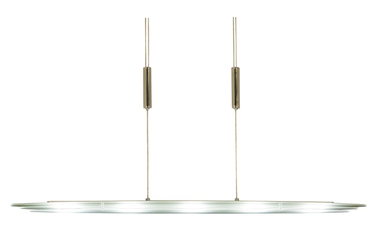 Pelkistetty, pitkänmallinen kattovalaisin, joka muodostuu kolmesta päällekkäisestä satiinilasilevystä, joiden väleistä valo myös siivilöityy sivusuunnassa loistaen valon pääasiassa alaspäin viidestä LED-yksiköstä. Molemmissa vaijereissa oma portaaton hissitoiminto, minkä avulla valaisin on helppo suoristaa kuin säätää korkeuttakin aina tarvittaessa. Himmennettävissä. •Korkeus: 60.0 mm •Syvyys: 150.0 mm •Leveys: 1000.0 mm •Tyyppi: 5×6 W LED •Valovirta: 5×480 lm •Elinikä: 30 000 h •Energialuokka: A •LED-moduli vaihdettavissa •Korkeuden säätöväli: 900-1200 mm