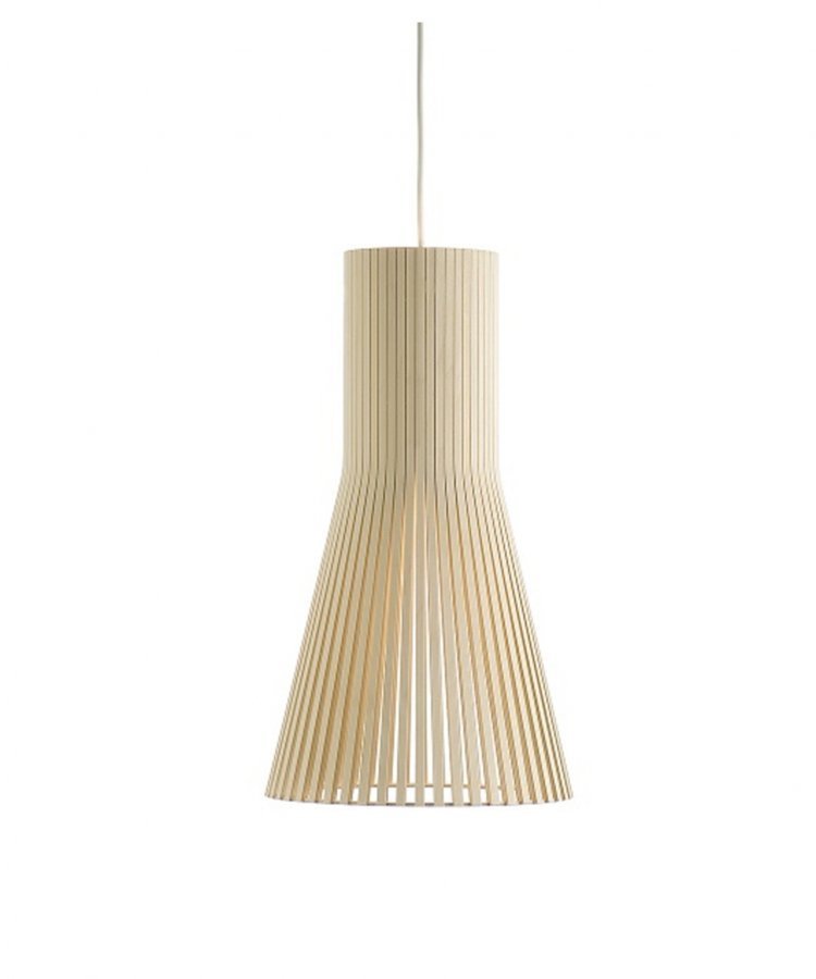 Design: Seppo Koho for Secto. Konsepti: Secto Designin Secto 4201- riippuvalaisin on mainio esimerkki innovatiivisesta puun käytöstä ja erinomaisista käsityötaidoista. Valaisin on syntynyt kunnioittaen Pohjoismaiden niemimaan metsiä ja yksinkertaista skandinaavista muotoilua. Secto -valaisimen yksinkertaiset, mutta mielenkiintoiset muodot, tarjoavat pieniä lokeroita, jotka peittävät valonlähteen varjoon ja takaavat näin ollen lämpimän ja sokaisemattoman valon. Ainutlaatuisia ja uraauurtavia valaisimia, jotka astuvat valaisuteollisuuden nykyaikaiseen maailmaan menettämättä kuitenkaan materiaalejaan tai teollisuudessa opittuja taitoja. Secto 4201 on valmistettu Suomessa PEFC-sertifioidusta, korkealuokkaisesta koivusta. Secto -valaisimissa käytetty koivu on lähtöisin Keski-Suomesta ja siten sen kuljetusmatkat pysyvät lyhyinä. Tuotantomenetelmät keskittyvät kierrätysmateriaaleihin. Sahanpuru kierrätetään puisiksi tableteiksi. Kestävää ja pitkälle ajateltua!. Pieni, kartiomainen Secto 4201 on alkuperäisen Secto- valaisimen pikkuveli ja se sopii erityisen hyvin matalakattoisiin huoneisiin.