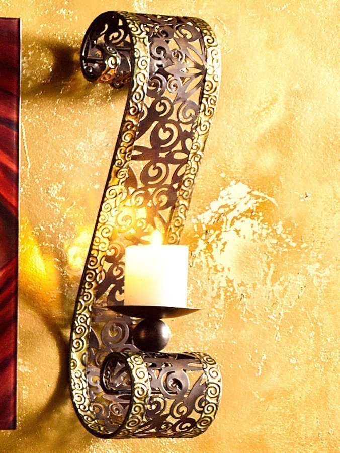 Upea kynttilänpidikesetti, joka tuo tilaan tyylikkyyttä ja mukavaa tunnelmaa. Koristeellinen, taivutettu pidike on rautaa, ja siinä on antiikkinen, ruskeahko, runsaasti koristeltu pinta.