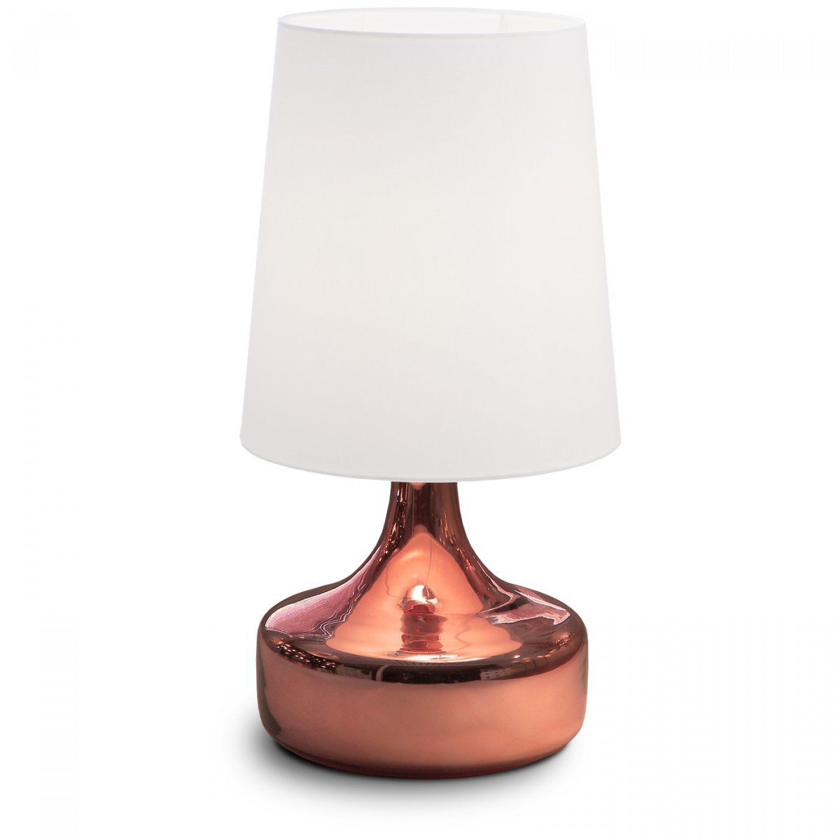 Upeasti muotoiltu pöytävalaisin kuparin värisellä lasijalalla ja puuvillavarjostimella. Pyöristetyt muodot ja kiiltävä jalka luovat pehmeyttä ja arvokkuutta sisustukseen. Puuvillavarjostin levittää valon pehmeästi tilaan. Sopii hyvin tuomaan valoa esimerkiksi makuu- ja olohuoneeseen.