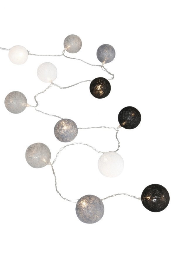 Pienet valopisteet luovat tähtitaivaan kaltaisen valaistuksen. Sytytä tunnelmalliset valot hämärän laskeutuessa. Materiaali: Puuvillalankaa ja muovia. Koko: ø 6 cm. Kuvaus: Koristevaloköynnös. 12 puuvillalankaista palloa. Led-valot. Muuntaja mukana. Pituus 4,8 m. Sopii ulkokäyttöön. Vinkki: Valoköynnös sopii kaikkialle – sisälle ja ulos. Toimii myös yövalona lastenhuoneen ulkopuolella.
