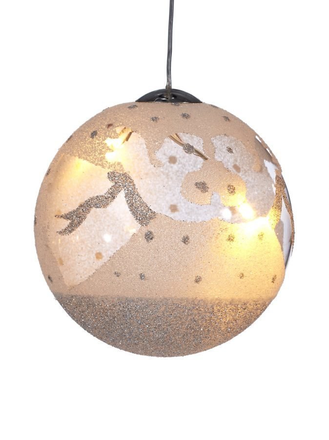Kauniissa lasipallossa on hilesomistetta ja enkelin kuva. Pallon sisällä on kaksi LED-valoa ja pallo tasapainottuu paristopallolla, jossa on kaksi CR2032-paristoa (sisältyvät mukaan). Pallon halkaisija on 7,5 cm ja johdon pituus on 25 cm.Pallon materiaali on suupuhallettua ja käsinmaalattua lasia ja paristokotelo on kromia.