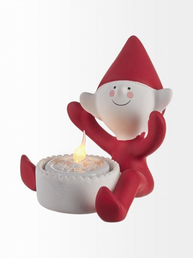 Tonttuaiheinen LED-valokynttilä (0,06 W/3 V) luo jouluista tunnelmaa. Kynttilän pohjassa on on/off-kytkin. Keraaminen kynttilä on tarkoitettu sisäkäyttöön. Patteri sisältyy pakkaukseen. Patterin kesto noin 200 t. Mitat ovat 9 x 9,5 cm.