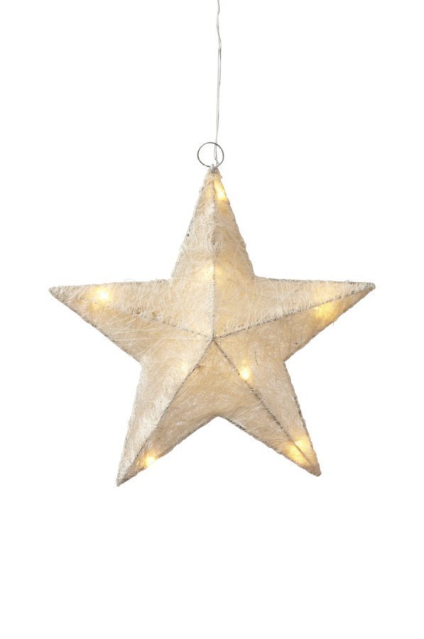 Talven koti-illat kaipaavat lämpöä, valoa ja tähtiä. Materiaali: Metallirunko ja sisalnarua. Koko: ø 30 cm. Kuvaus: Valotähti tiiviisti punottua sisalnarua. 10 LED-valoa mukana. Sisäkäyttöön. Vinkki: Ripusta kaksi tähteä vierekkäin eri korkeudelle.