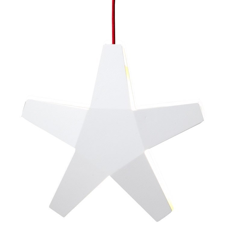 Stjärna 600, valkoinen punaisella johdolla, SMD designilta. Adventtitähti maalattua valkoista metallia. Voidaan ripustaa tai asettaa esim. pöydälle. Punainen kangaspäällysteinen johto virrankatkaisijalla, pituus 5 m. Saatavana kahdessa koossa: 40 cm ja 60 cm. Suunnittelu: Stina Sandwall.