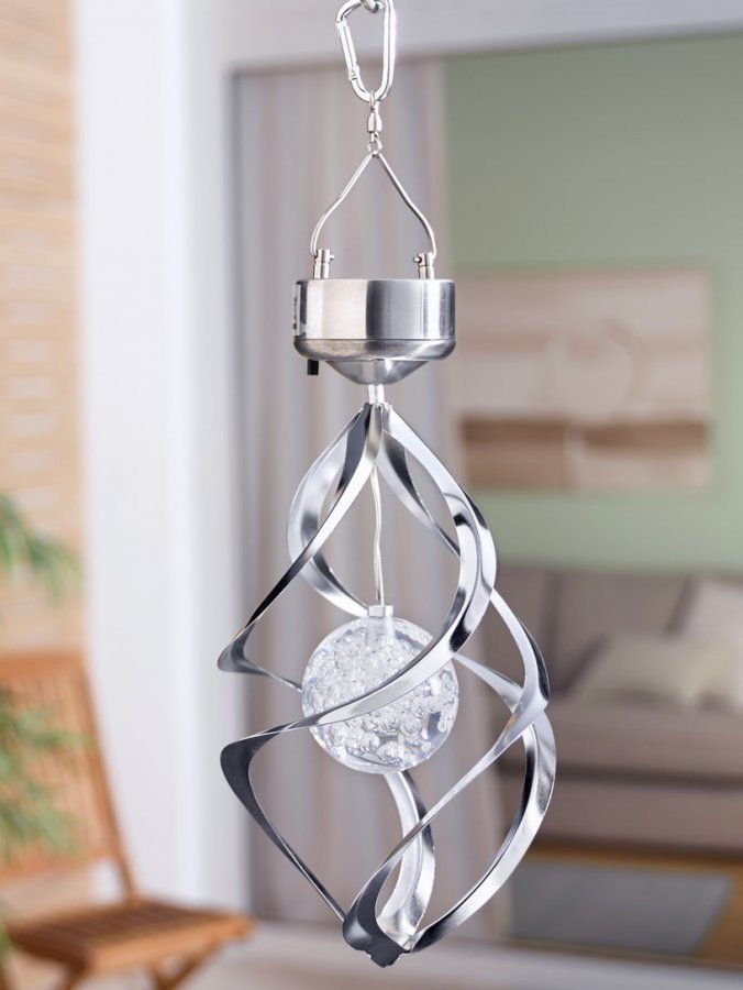 Auringonvalolla toimiva LED-mobile. Heijasta väriä vaihtavalla LED-mobilella tyylikkäitä kuvioita huoneen kattoon, parvekkeelle, terassille tai pihallesi. Päivällä filigraanitekniikkaa käyttäen valmistettu designesine kääntyilee tuulessa, ja auringonvalo heijastuu sen kauniista akryylipallosta lukemattomin kuvioin. Pimeän saapuessa LED-valot syttyvät ja luovat pyörivän 3-osaisen mobilen kanssa satumaisen tunnelmavalaistuksen. Koko: Akryylipallo: Ø 6 cm, kokonaiskorkeus: 27 cm.