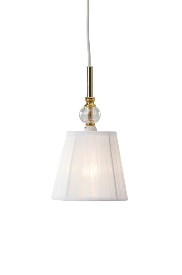 Koristeellinen valaisin, jossa lasipallo. Varjostin organzaa. Runko metallia. Korkeus 20 cm, , ø 15 cm. Johdon pituus 120 cm. E14, enintäään 20 W.
