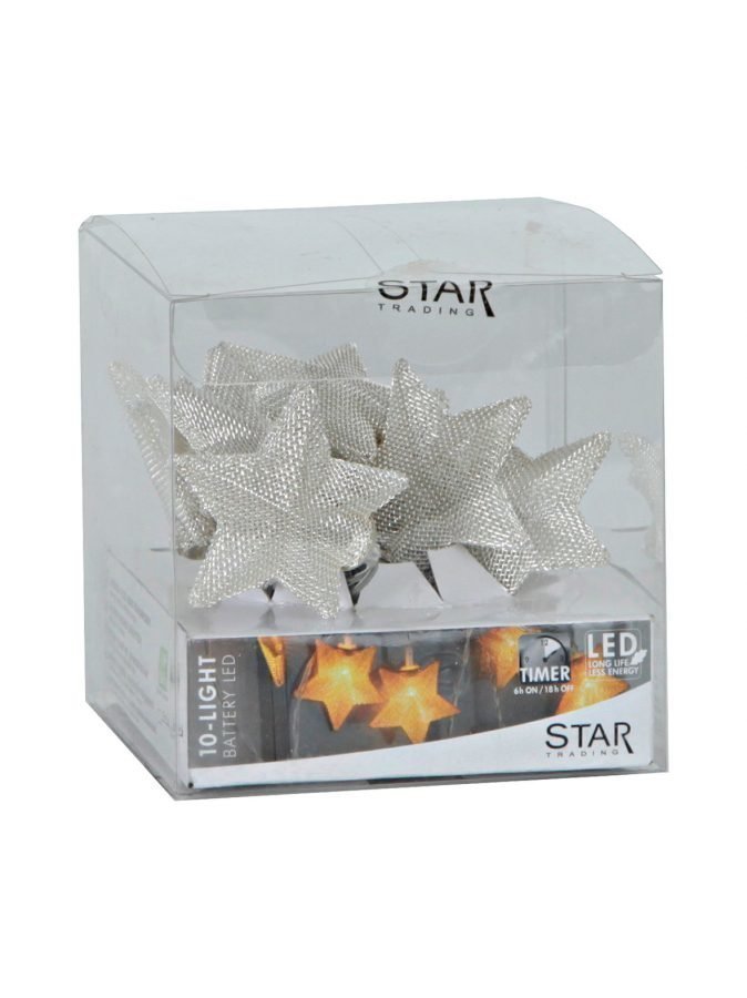Anna tähtien tukkia tunnelmallisesti! Paristokäyttöisessä sisävalosarjassa on ajastin ja 10 metallilankatähteä, joiden sisällä on yksi kirkas LED-lamppu. Pienessä valosarjassa on 1,85 metrin johto, jossa on 15 cm:n välein yksi LED. Viimeisen LED:in ja paristokotelon välinen etäisyys on 50 cm. Tuote vaatii toimiakseen 3 kappaletta AA-paristoja, jotka eivät sisälly pakkaukseen.