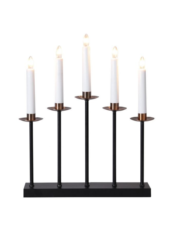 Yksinkertaisen tyylikäs viisihaarainen metallikynttelikkö tuo valoa talven pimeyteen elegantisti.