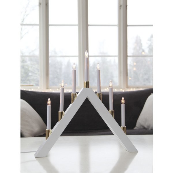 Valkoinen LED-kynttelikkö puuta, messinkiset koristeet. Sisäkäyttöön.