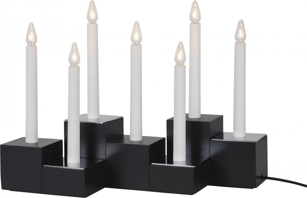 Musta 7-haarainen LED-kynttelikkö puuta. Sisäkäyttöön.