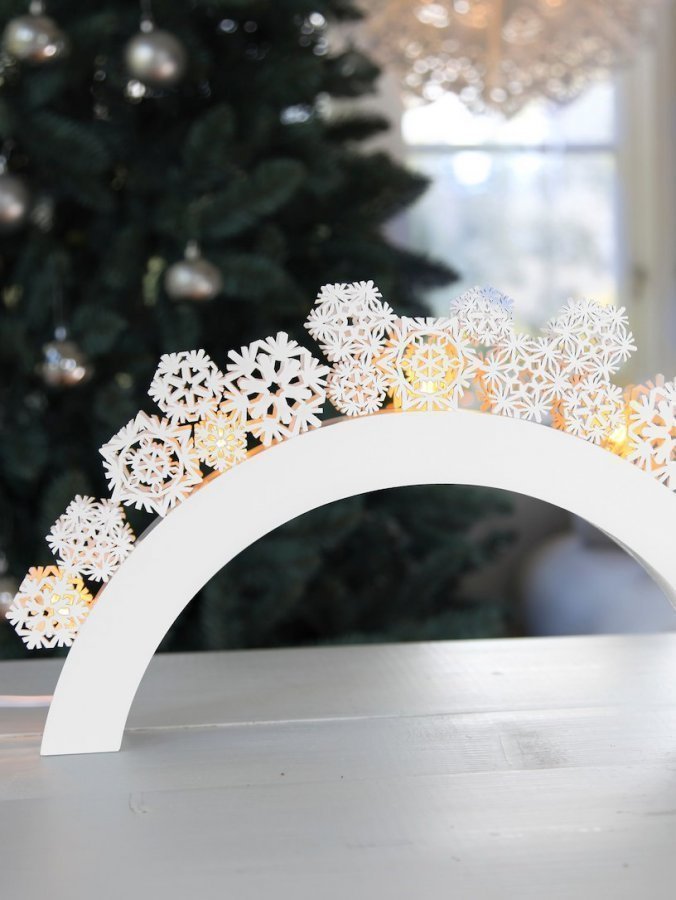 Kauniisti kaaren muotoon muotoiltu LED-valaisin, joka on valmistettu puusta. Puukaaren päällä puusta valmistettuja lumihiutaleita ja jääkristalleja, joiden taakse pienet LED-valot on asetettu. Moneen eri sisustustyyliin sopiva valaisin, joka antaa tunnelmallisen valon. 5 lämpimänvalkoista hohtodiodia, jossa E10-kanta, teho alle 30 lumenia. Verkkovirta 230 V AC. Korkeus/leveys n. 26/32 cm.