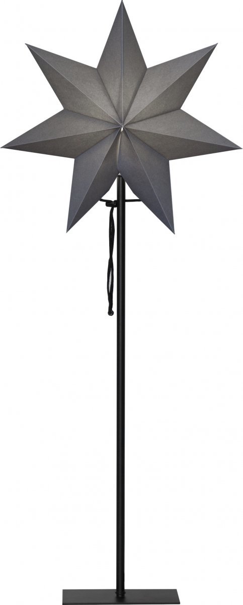 Harmaa paperinen tähti mustalla metallijalalla. Korkeus 85 cm.