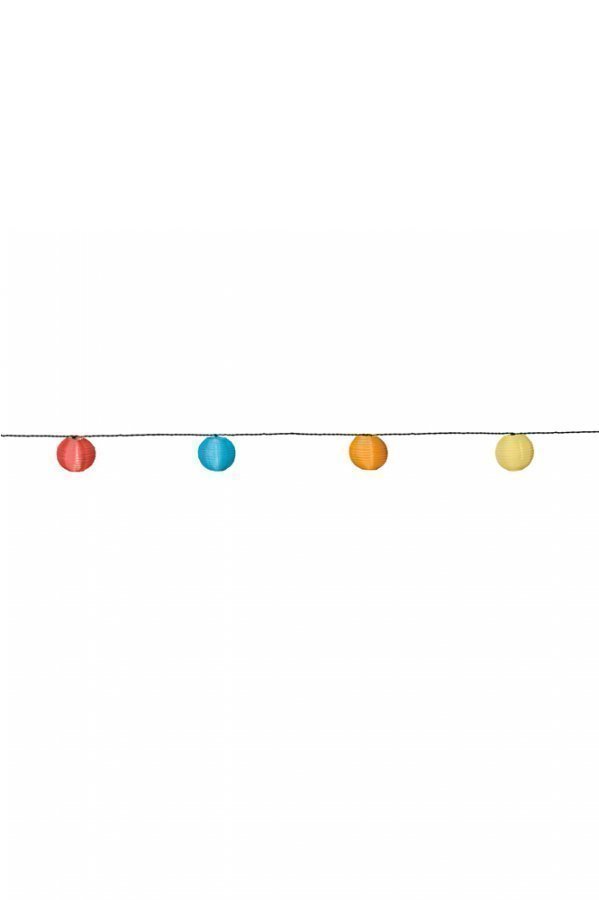 Pituus 470 cm. Syvyys 7,5. Korkeus 7,5 cm. Muovinen johto, jossa valkoiset kangaspallot. 10 kangaspalloa, joita ei voi vaihtaa. LED-polttimot mukana. 2 metriä ennen ensimmäistä valoa. Akku mukana.