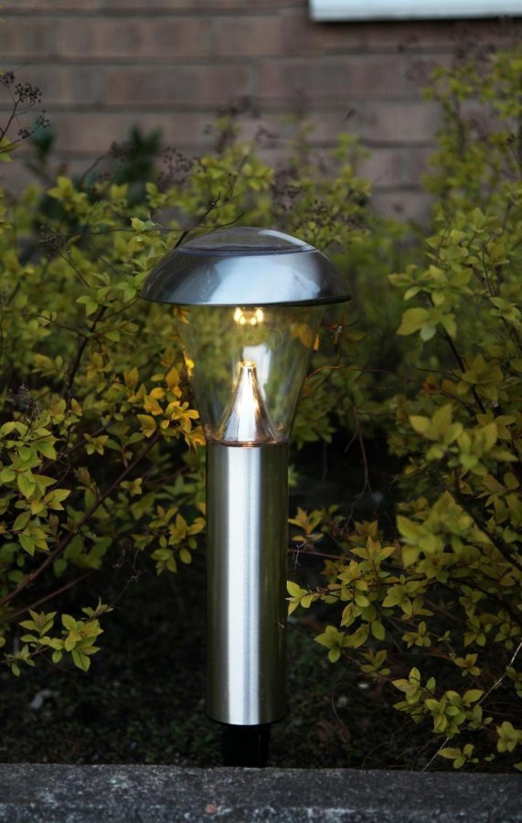 Aurinkokennolla toimiva ulkovalaisin ruostumatonta terästä. 14 lumenin valo. Leveys 15 cm. Korkeus 36 cm.