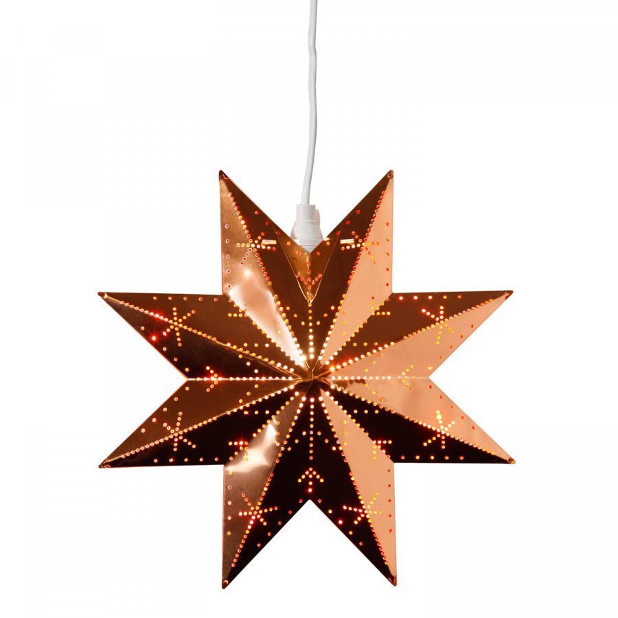 Classic joulutähti, Star Trading. Joulutähtien klassikkojen klassikko. Perinteisen tähtimuodon omaava kuparinen joulutähti, jonka rei’itetyn pinnan läpi siivilöityy lämmin ja kodikas loiste. Tähti on halkaisijaltaan 28 cm. E14. A++-E. Kaapeli sekä virrankatkaisija & pistoke. Valonlähde ei kuulu hintaan.