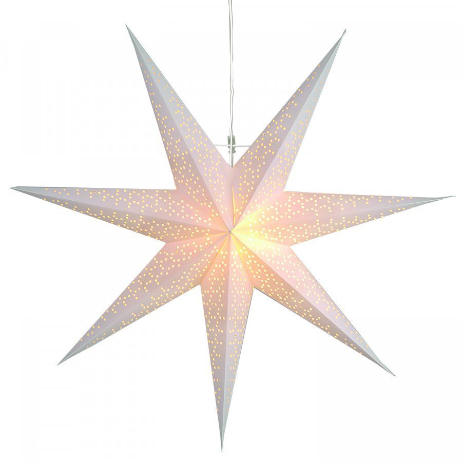 Kuvioitu valkoinen paperitähti. Kaunis tähti ikkunan koristeeksi. Tähdessä on tilaa valonlähteelle. Korkeus on 70 cm.