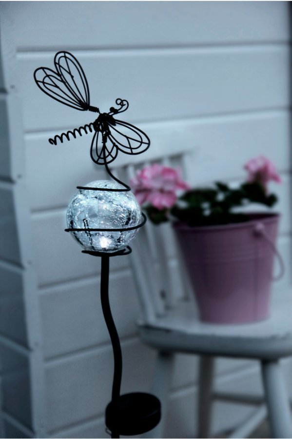 Aurinkoenergialla toimiva valaisin, jossa perhonen ja lasipallo. Metallia ja lasia. Leveys 15 cm. Korkeus 85 cm.