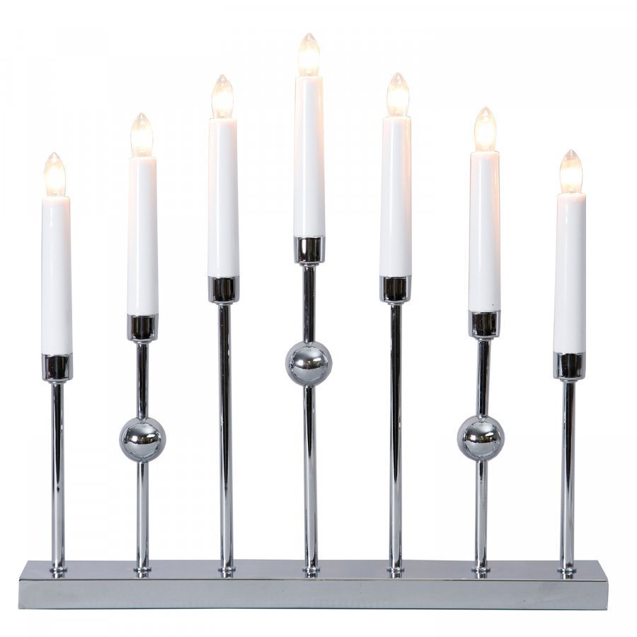 Gustavo adventti kynttilänjalka merkiltä Star Trading on moderni metallinen kynttilänjalka pallonmuotoisilla yksityiskohdilla. Sopii kauniisti mm. Ikkunalaudoille tai pöydille joulun aikaan. 7Kpl E10 lamppuja kuuluu mukaan.