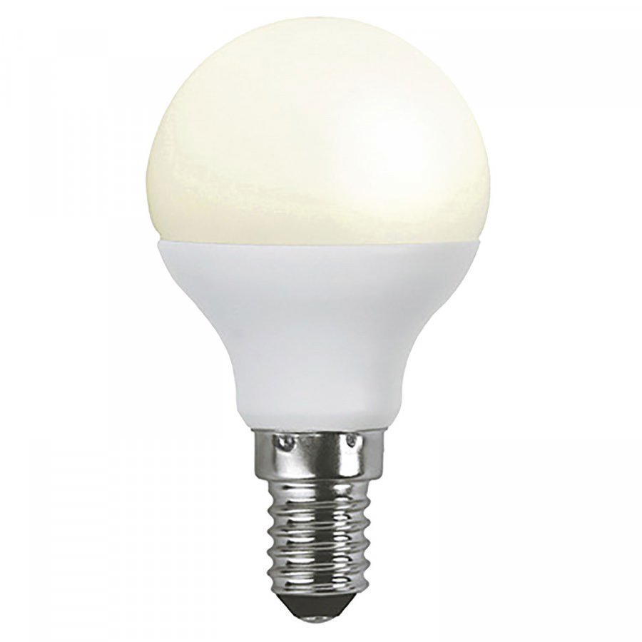 LED-lamppu E14 P45, opague Ra90 merkiltä Star Trading. Valonlähteen 3,5W vastaa perinteisen hehkulampun 25W. Lampun pitkä paloaika on n. 25000 tuntia ja valovirta 250 lumenia tekee LED-lampusta tulevaisuuden valonlähteen. Valinta niille, jotka haluavat kestävän ja energiaa säästävän valonlähteen. LED-lamppu säteilee lämmintä valkoista valoa.
