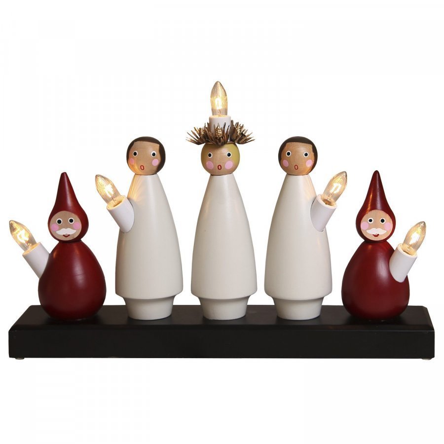 Luciakuoro kynttelikkö, Star Trading. Leikkisä ja hauska kynttelikkö luciakuorolla. Kynttelikkö on valkoinen, jossa on lucia, kaksi tiernapoikaa sekä kaksi tonttua, jotka nostavat joulutunnelman uudelle tasolle. Kyntteliköllä on tunnelmaa luovat, koristeelliset lamput. Kaunis ikkunalla ja sopii erinomaisesti lastenhuoneeseen. Tulee takuuvarmasti olemaan suursuosikki joulunaikaan niin isompien kuin pienempienkin mielestä. Kynttelikkö ainoastaan sisäkäyttöön, IP20.