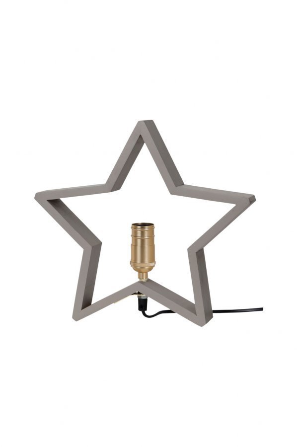 Puinen tähti, jossa metallisokkeli. Kaunis koriste pöydälle tai ikkunaan. Yhdistä tähteen tyylikäs valonlähde. Korkeus 29 cm, leveys 30 cm, syvyys 9 cm. Lampunkanta E14. Johdon pituus 180 cm. Valonlähde ei mukana.