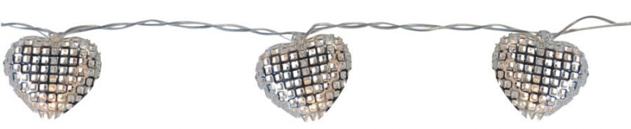 Valoköynnös, jossa pieniä metallisydämiä. Pituus 90 cm. 10 LED-lamppua (eivät vaihdettavissa). Toimii kolmella AA-paristolla (tilaa erikseen). Kätevä ajastintoiminto. Ajastimessa 6 18 tunnin toisto. Paloaika n. 100 tuntia.