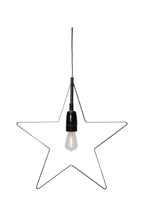 Koristeellinen musta metallitähti, jossa E14-lampunkanta. Sisäkäyttöön. Kaunis koriste kattoon tai seinälle. Valonlähde mukana. Syvyys 3 cm, korkeus 33 cm, leveys 33 cm.