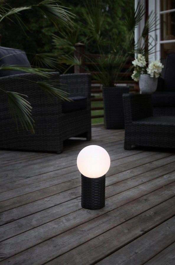 Pallonmuotoinen aurinkokennovalaisin rottinkikorissa. Leveys 15 cm. Korkeus 28 cm.