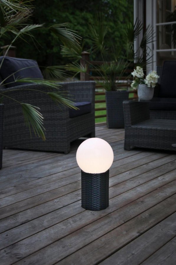 Pallonmuotoinen aurinkokennovalaisin rottinkikorissa. Leveys 20 cm. Korkeus 36 cm.