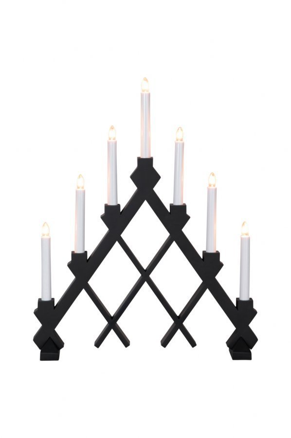7-haarainen puinen Rut-sähkökynttelikkö. Korkeus 53 cm. Syvyys 7 cm. Leveys 42 cm. 1,8 m:n johto, jossa virtakatkaisin.