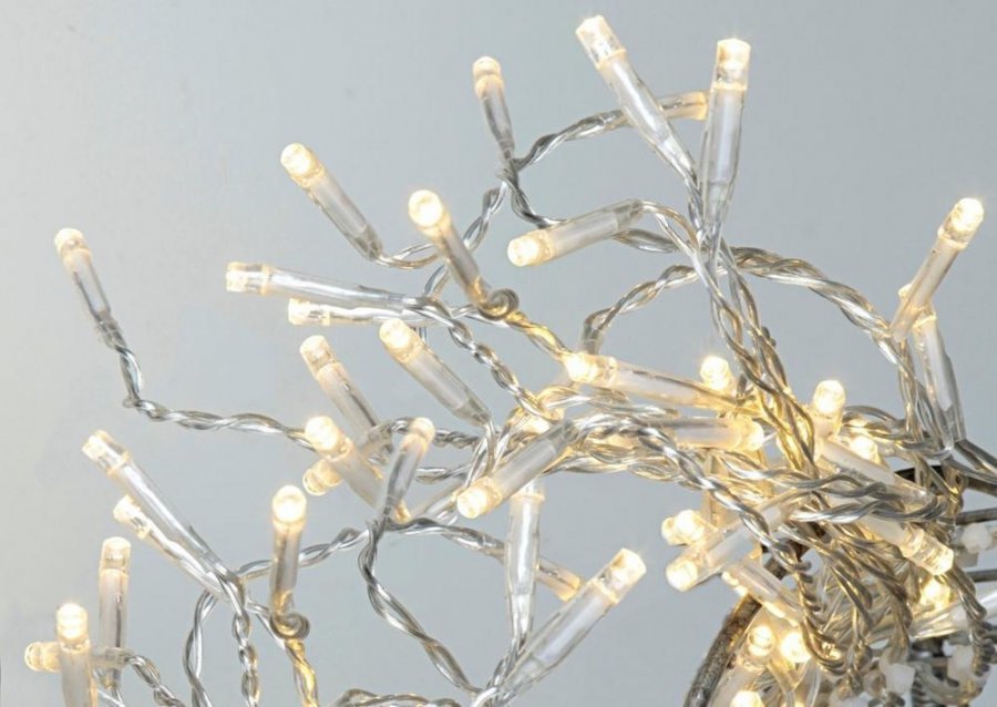 Serie-LED-valoköynnös, jossa läpikuultava johto. Pituus 16 metriä, 160 lämpimän valkoista LED-lamppua. Kaunis valoköynnös ulkokäyttöön.