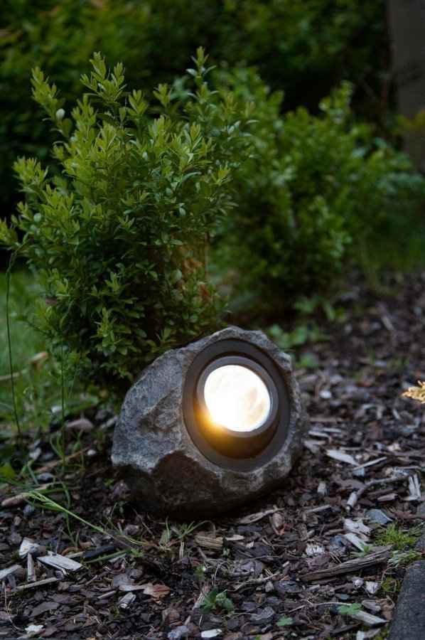Koristeellinen aurinkokennokivi, jossa on suunnattava valo. Tuotteen mukana tulee ladattava akku.