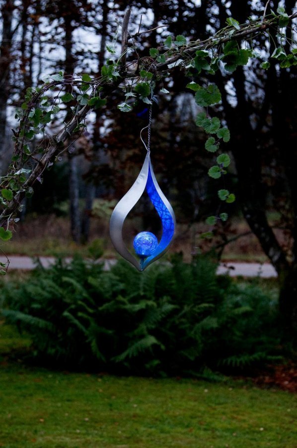 Riippuva, liekin muotoinen aurinkokennokoriste. Hohtaa sinistä valoa pimeässä.