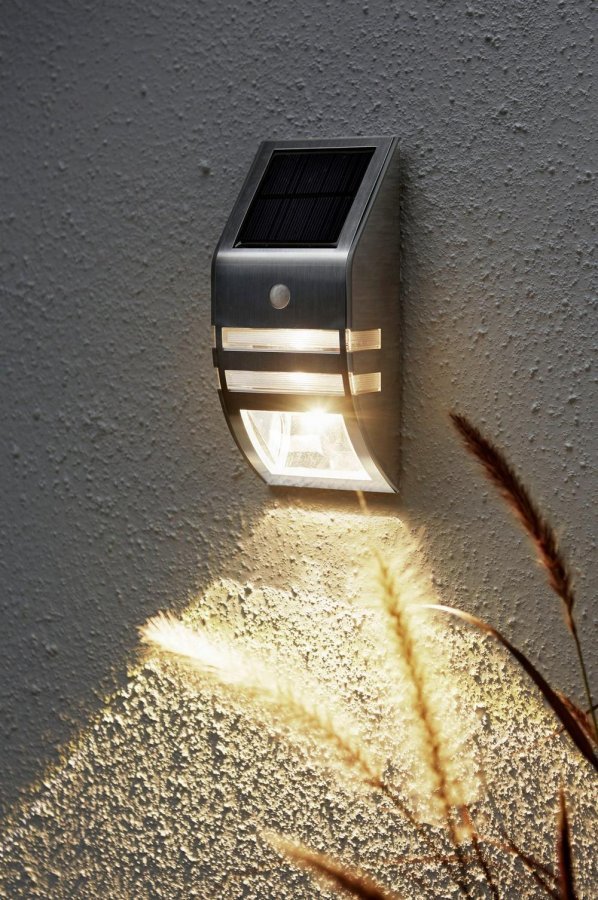 Aurinkokennokäyttöinen seinävalaisin, jossa on liiketunnistin. Valaisee ensin 50 Lm:n teholla ja 45 sekunnin kuluttua 2 Lm:n teholla. Hieno valaistus julkisivuun ja sisäänkäyntiin.