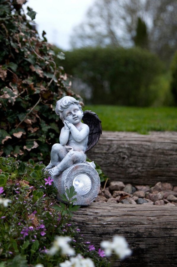 Koristeellinen aurinkokennolla toimiva enkeli. Tuotteen mukana tulee ladattava akku.
