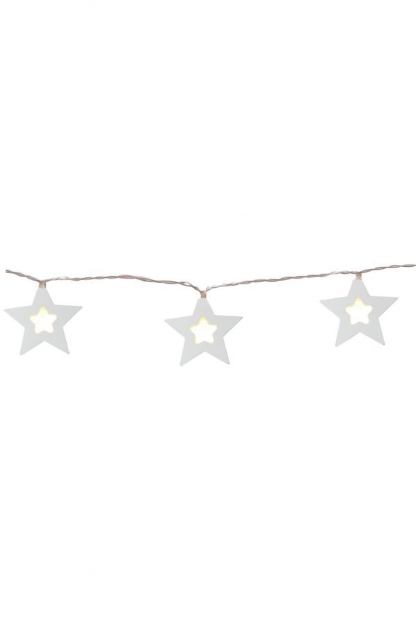 Koristeellinen valoköynnös sisäkäyttöön. Valkoiset tähdet. Valoköynnöksessä on 10 LED-lamppua. Paristokäyttöinen. Voidaan käyttää erilaisiin koristeluihin, kuten esim. kattauksiin, kukka-asetelmiin, ikkunaan, seinälle jne. Sisäänrakennetun ajastimen avulla määrittelet helposti valoköynnöksen syttymisen ja sammumisen. Pituus: 135 cm, korkeus: 6 cm