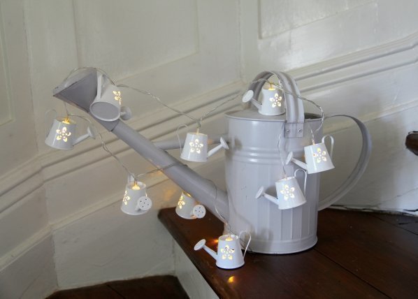 Valoketjussa on valkoisia, metallista valmistettuja pieniä kastelukannuja – kastelukannujen korkeus on 5,2 cm,… Lue lisää »