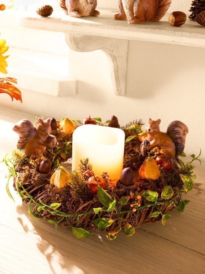 LED-valaistu syyskranssi, jossa suloisia oravia. Kranssi valmistettu rottingista ja oksista. Oravat polyresiiniä.