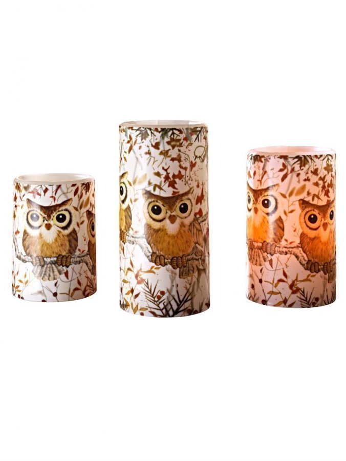 Eläimellisen kauniit LED-kynttilät ovat kaunis ja turvallinen valinta tunnelmallisiin iltoihin. Paristokäyttöisen LED-kynttilät on koristelty pöllöaiheisella kuvioinnilla ja ne on valmistettu vahasta. Kynttilät toimivat AAA-paristoilla (paristot eivät sisälly toimitukseen). Kynttilän Ø n. 7,5 cm, kynttilöiden korkeudet n. 10 cm, 12,5 cm ja 15 cm.