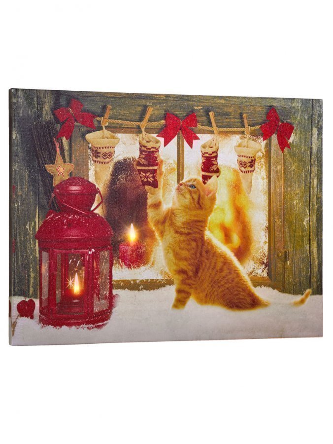 Kaunis taulu, jossa lumella istuva kissa ja punainen kynttilälyhty. Kuva on tehty puukehyksiin pingotetulle taulukankaalle. LED-valo korostaa tunnelmallista vaikutelmaa. Varustettu on-/off-painikkeella. Paristokäyttöinen: 2x AA (eivät sisälly toimitukseen).