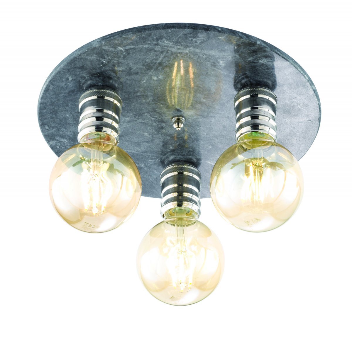 Claire kattovalaisimen kupu on mustaa marmoria ja lampun kannat kromiset. Valaisimen halkaisija 30 cm ja korkeus 12 cm. Valaisimessa on kolme E27-kantaa, polttimot ei sisälly mukaan. Suosittelemme käyttämään valaisimessa pyöreitä globe filament polttimoita. Valaisin kiinnitetään kattoon kiinnitysraudalla ja kahdella ruuvilla, sähköistys sokeripalalla. Energialuokka A++-E.