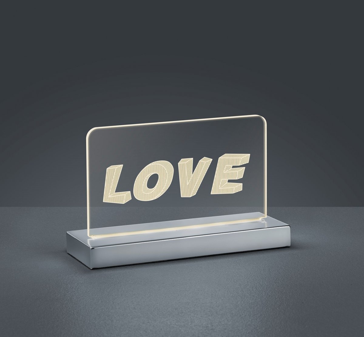 Love pöytävalaisimen kupu on kirkasta akryyliä jossa kaiverrettuna teksti ”Love”. Runko on kromia. Valaisimessa on integroitu LED valonlähde 7 W, valoteho 400 lm ja valon väri säädettävissä 3000 + 4000 + 6500 K. Värilämpötilan säätö tapahtuu painamalla on/off kytkimen pois ja päälle peräjälkeen. Valaisimen korkeus 12,5 cm ja leveys 20 cm. Sisältää liitosjohdon jossa on/off kytkin.