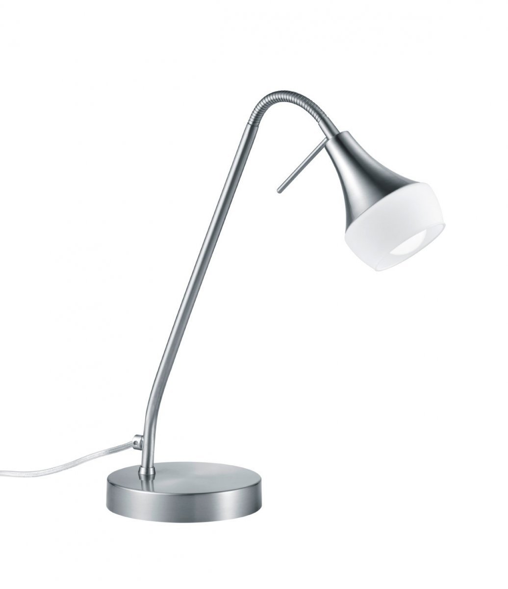 Trumpet pöytävalaisimen kupu on valkoista lasia ja runko harjattua terästä. Valaisimessa E14-kanta, polttimo ei sisälly mukaan. Korkeus 40,5 cm ja leveys 13 cm. On/off kytkin liitosjohdossa. Energialuokka A++-E.