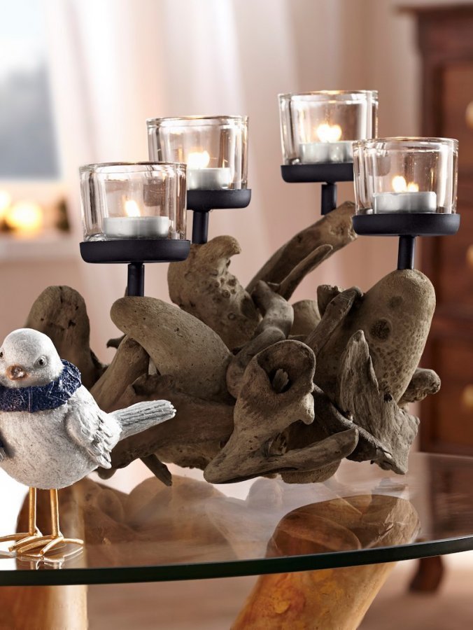 Tuikkuteline, jossa 4 jalallista lasilyhtyä ja puinen jalusta (ajopuuta). Mitat n. (KxØ) n. 25 x 25 cm. Tuikkukynttilät eivät sisälly toimitukseen.
