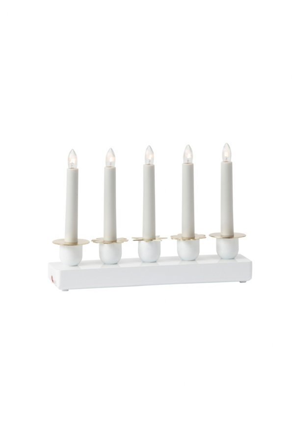 Tunnelmallinen sähkökynttelikkö, jossa erikoiset mansetit ja punainen kangaspäällysteinen johto. Materiaali: Puuta ja metallia. Koko: Korkeus 18 cm. Leveys 26,5 cm. Syvyys 7 cm. Kuvaus: Sähkökynttelikkö puuta, mansetit metallia. Sisäkäyttöön. Punainen kangaspäällysteinen johto 180 cm, virtakytkin johdossa. Lamput mukana. Kanta/lamppu: 5 x 1,8 W. Vinkki: Huoneessa tulee olla monta valonlähdettä. Sopiva määrä normaalikokoisessa huoneessa on 6–8 valaisinta.