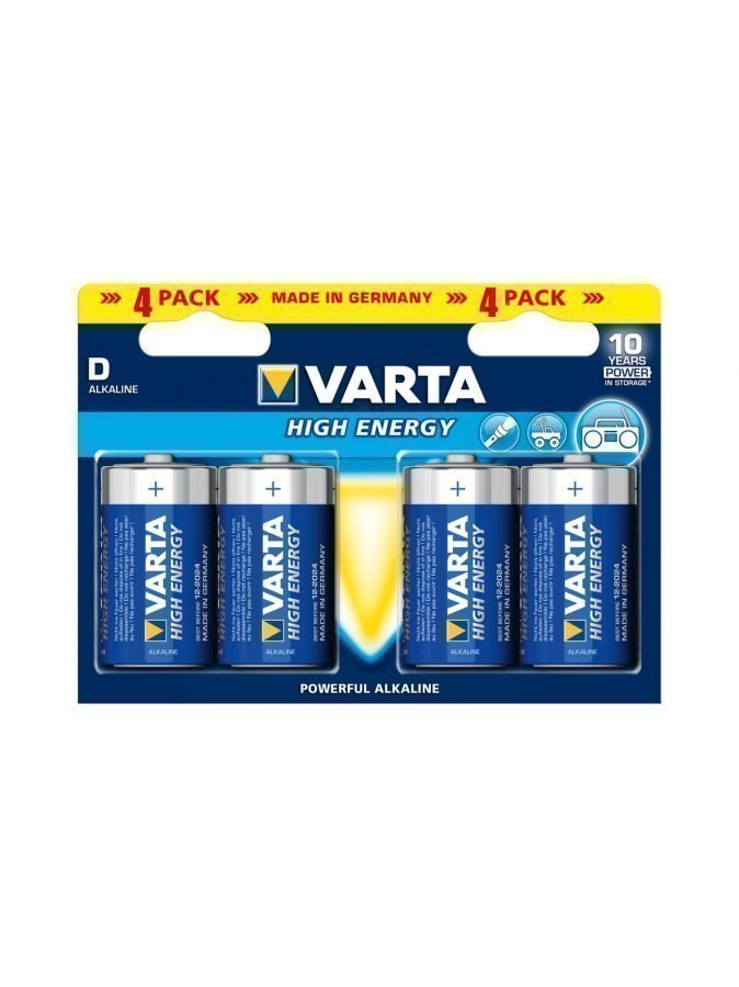Pakkaus sisältää 4 kappaletta Vartan High Energy D Alkaline -paristoja, jotka soveltuvat hyvin esimerkiksi taskulamppuun, kauko-ohjattavaan autoon ja kannettavaan nauhuriin.