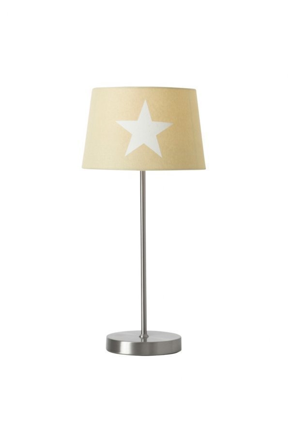 Kaunis kangasvarjostin, jossa painettu kuvio. Jalka metallia. Korkeus 55 cm, varjostimen ø 25 cm, varjostimen korkeu 16 cm. Johdon pituus 200 cm. E14, enintään 30 W.