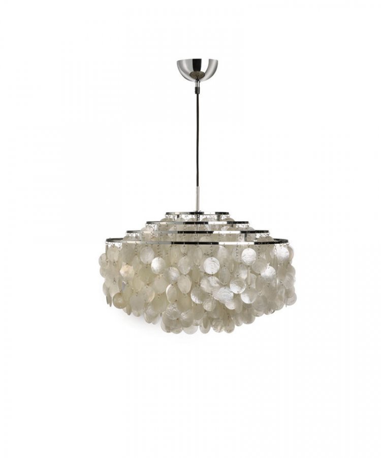 Design: Verner Panton for Verpan. Konsepti: Verner Panton suunnitteli FUN 10 DM Riippuvalaisimen vuonna 1964. Valaisin koostuu helmiäiskuorista, joita metallirenkaat kannattelevat. Näin valo leviää ihastuttavalla tavalla valaisimen ympärille. Verner Panton (1926-1998) on eräs Tanskan värikkäimpiä arkkitehtuuriin ja muotoiluhistoriaan liittyviä henkilöitä. Panton valmistui Kööpenhaminan taideakatemiasta vuonna 1995, ja tunnetaan voimakasvärisistä, orgaanisista tuotteistaan, sekä rakkaudestaan muoviin. Hän on saanut useita tunnustuksia epätavallisesta ja uraauurtavasta työstään.